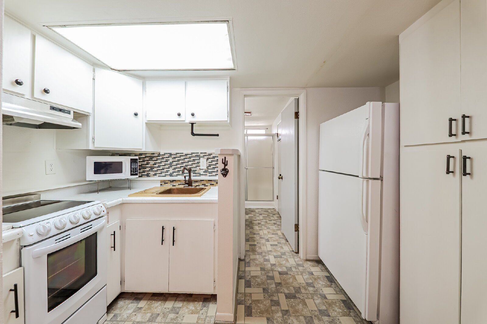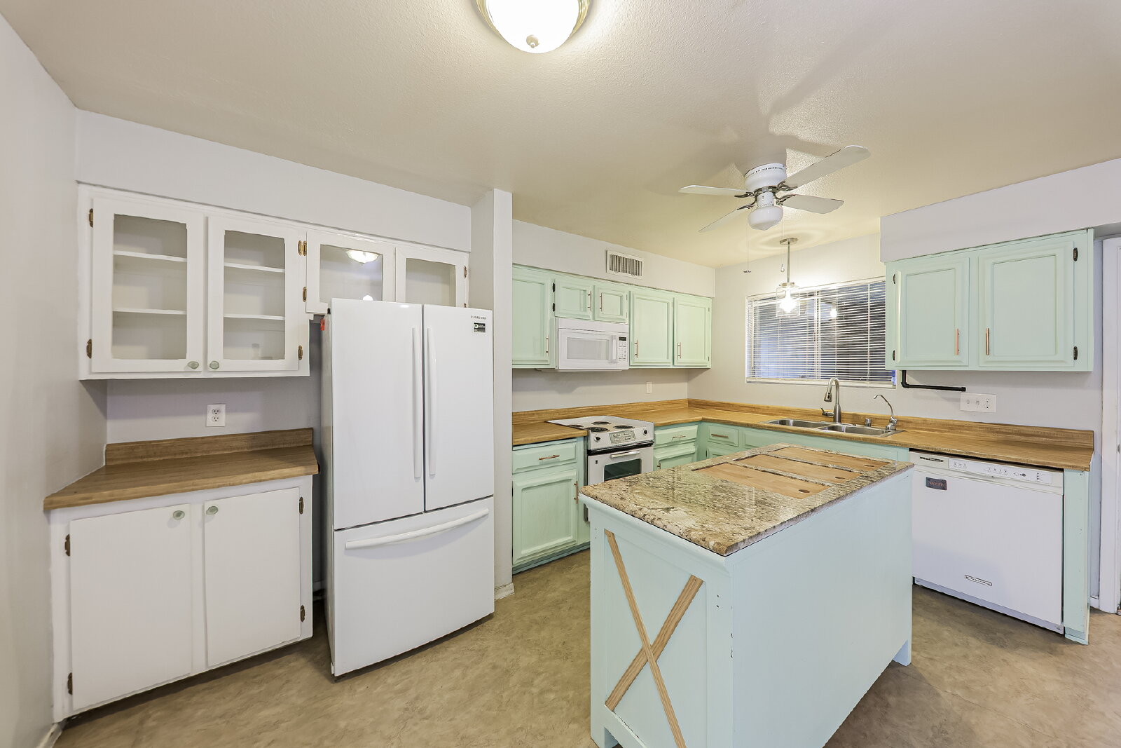The eat-in kitchen offers plenty of cabinet space along with white appliances, making it both functional and inviting. An enclosed Arizona room provides additional living space perfect for relaxing or entertaining.
